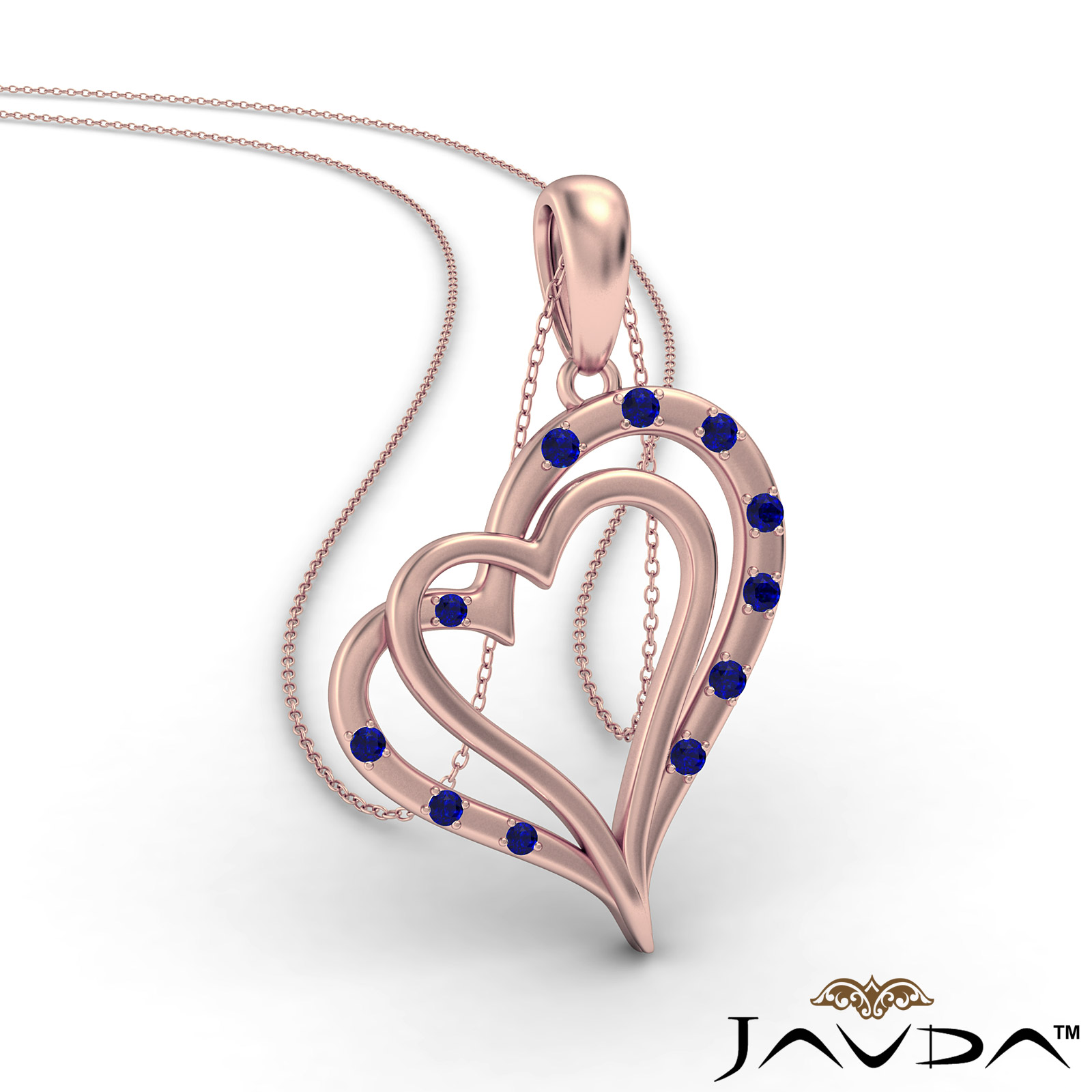 Adorable two heart sapphire gemstone pendant necklace crafted in 18k Rose Gold. This heart pendant showcases sapphire in a micro pave setting.