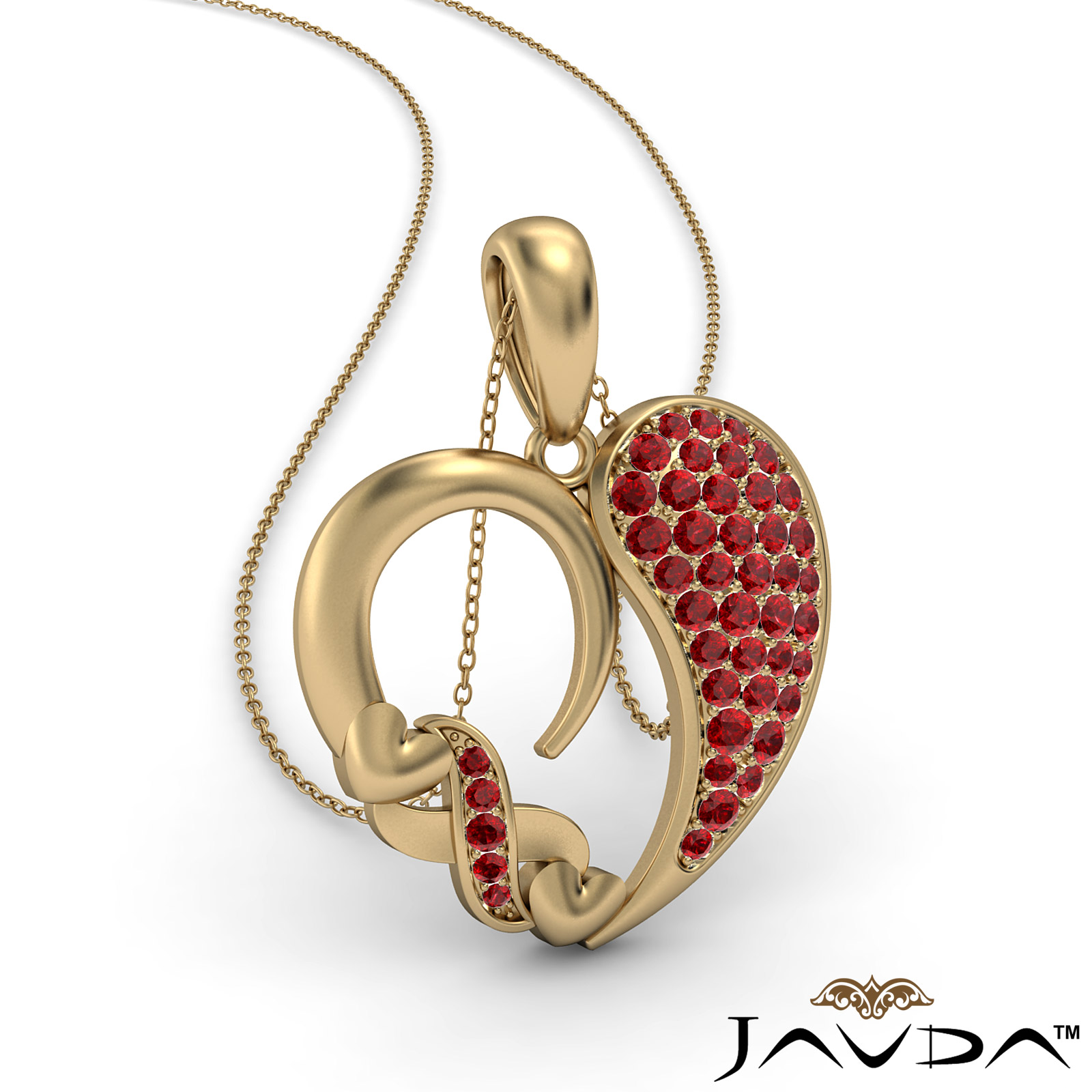 A stylish cluster gemstone XO heart pendant necklace made in precious 18k Gold Yellow. This charming pendant features round ruby gemstone in a micro pave setting with a beautiful XO pattern on heart edge.