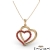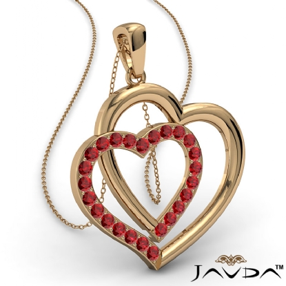 This eye catching look two heart pendant necklace made in precious 18k Gold Yellow. Features a polished finished heart cradled to another heart with tiny round ruby gemstone in a micro pave setting secures in a polished finish bail.