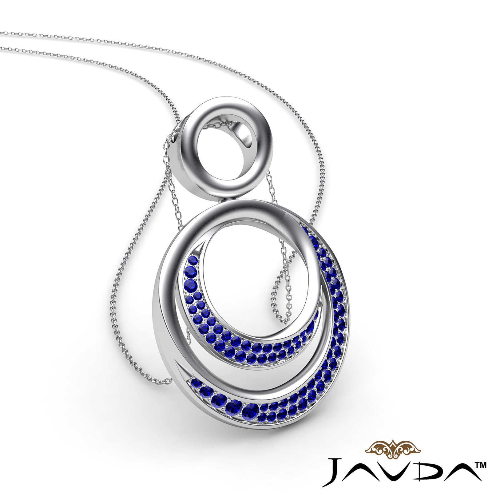 The dazzling double circle pendant necklace crafted in 18k Gold White. Features graduated round sapphire gemstone in a micro pave setting hang with a beautiful 18 inch rolo chain.