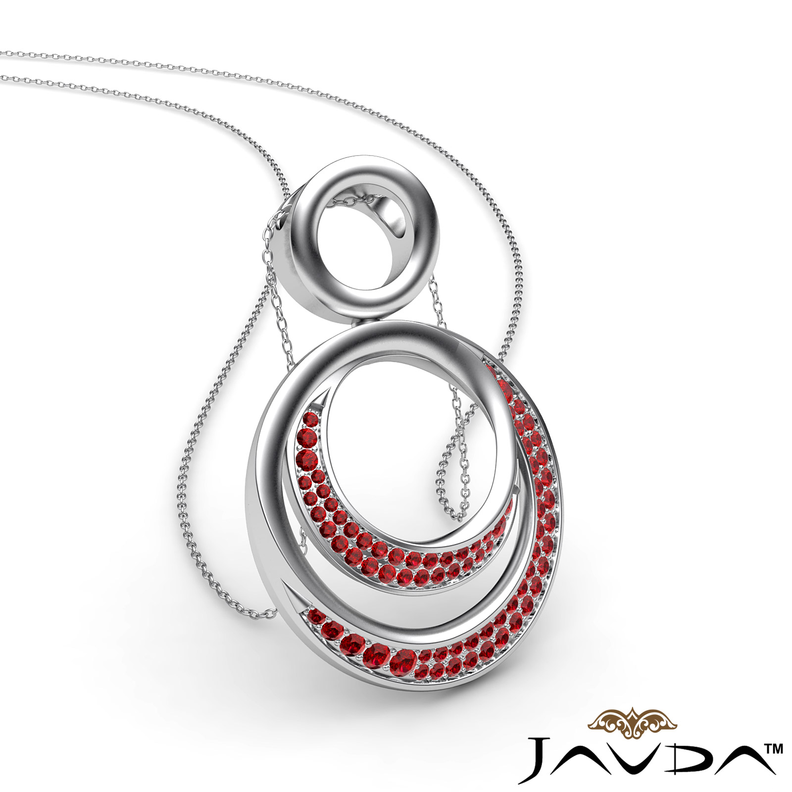 The dazzling double circle pendant necklace crafted in 18k Gold White. Features graduated round ruby gemstone in a micro pave setting hang with a beautiful 18 inch rolo chain.