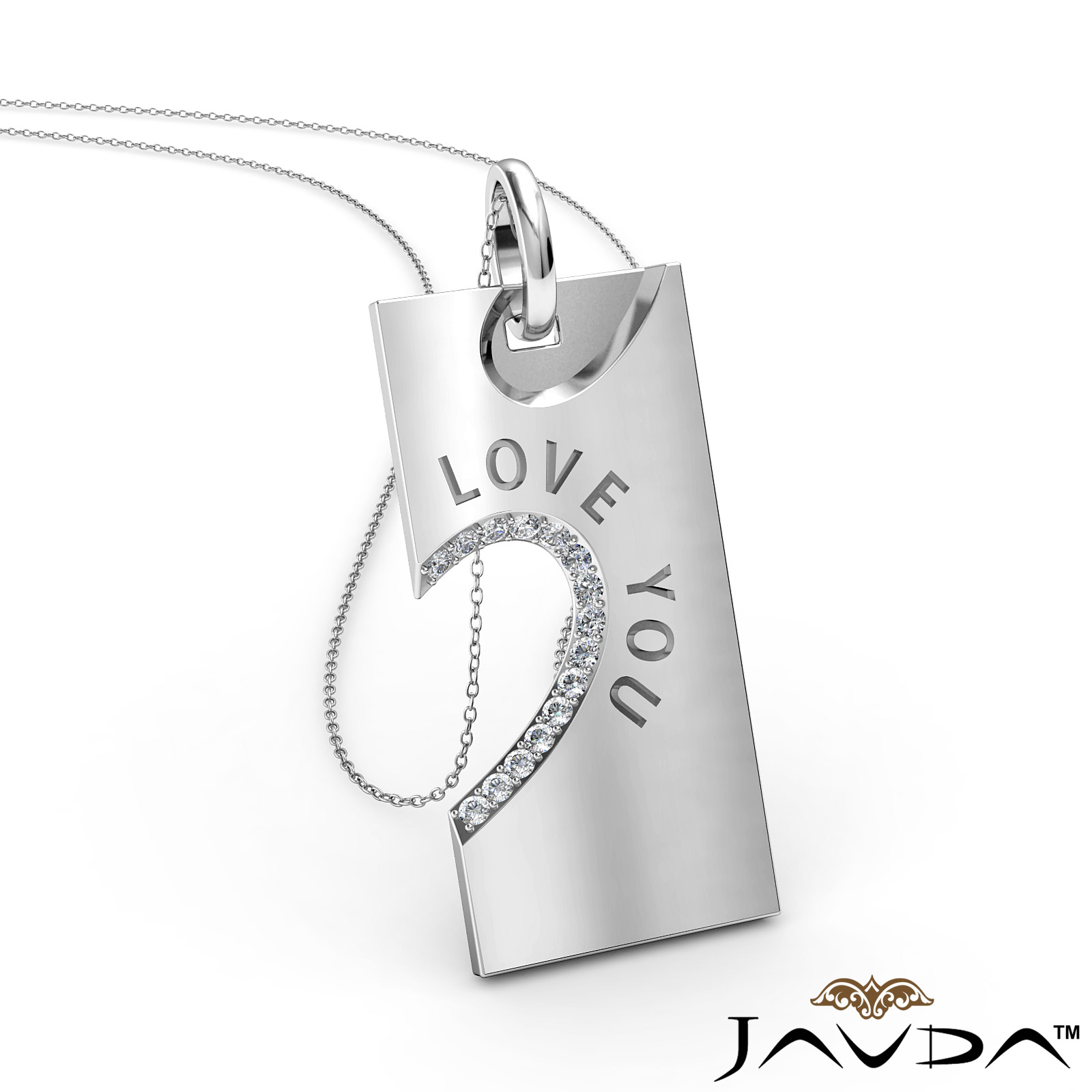 Say I Love You with love you diamond heart pendant necklace made in 18k Gold White. This charm pendant features a round diamonds in a micro pave setting with beautiful engraving of Love You. This pendant hang on 18 inch rolo chain that secures in a polished finish ring clasp.