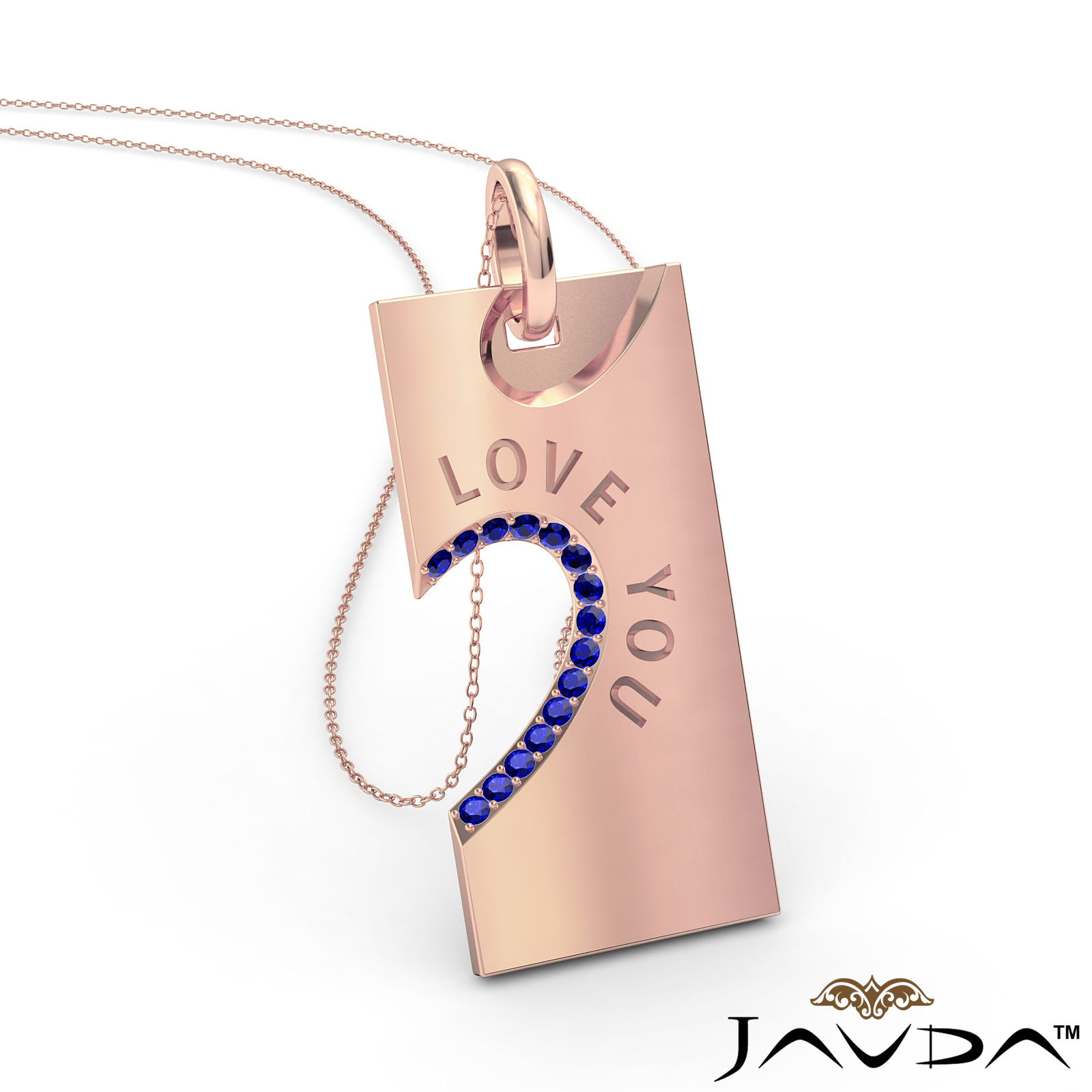 Say I Love You with love you sapphire heart pendant necklace made in 18k Rose Gold. This charm pendant features a round sapphire gemstone in a micro pave setting with beautiful engraving of Love You. This pendant hang on 18 inch rolo chain that secures in a polished finish ring clasp.