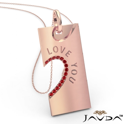 Say I Love You with love you ruby heart pendant necklace made in 14k Rose Gold. This charm pendant features a round ruby gemstone in a micro pave setting with beautiful engraving of Love You. This pendant hang on 18 inch rolo chain that secures in a polished finish ring clasp.
