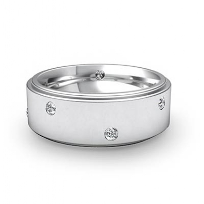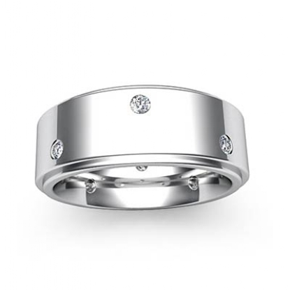 A touch of classic flat men's diamond eternity wedding band is made from solid Platinum 950. Featuring polished finish flat edge and center with round diamond in a bezel setting.