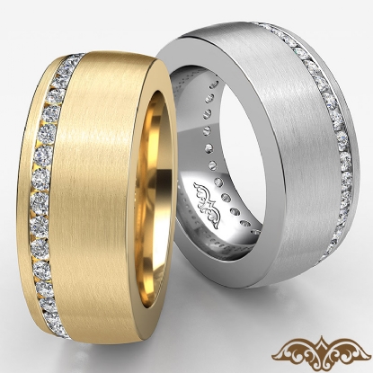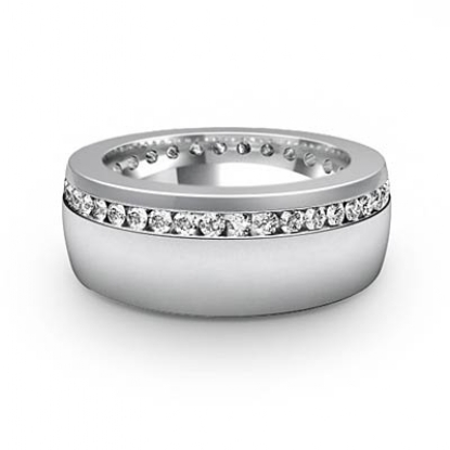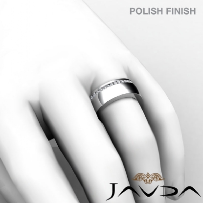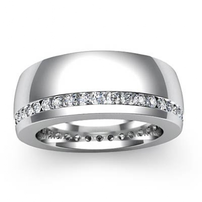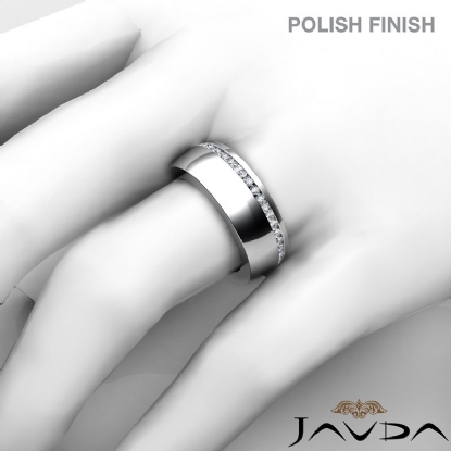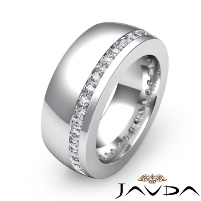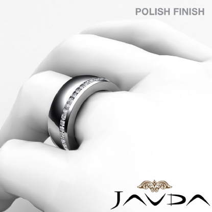 Elegant looking offset channel round diamond men's eternity wedding band is made from precious metal Platinum 950. Featuring polished finish dome band with round cut diamonds set in a channel setting.