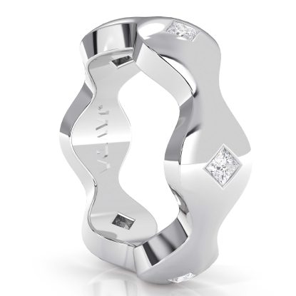 The unique and stylish wave design princess diamond men's eternity wedding band is crafted in 18k Gold White. Featuring this wedding ring polished finish wave design band with princess cut diamonds set in a bezel setting.