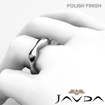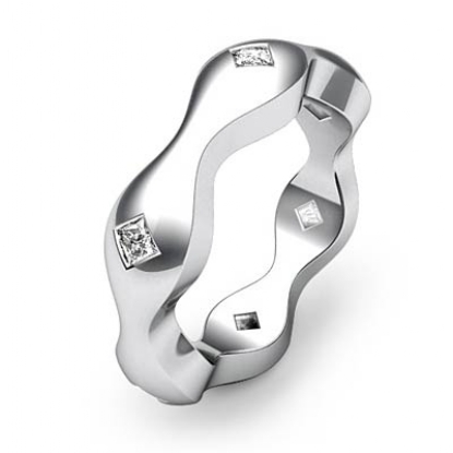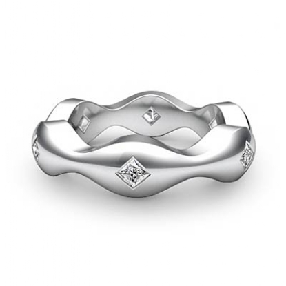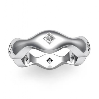 The unique and stylish wave design princess diamond men's eternity wedding band is crafted in Platinum 950. Featuring this wedding ring polished finish wave design band with princess cut diamonds set in a bezel setting.