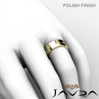 The stylish high polished finish men's eternity diamond wedding band is made from solid 14k white gold. Featuring flat polished finish band with 0.50 carat round cut diamond in a bezel setting.