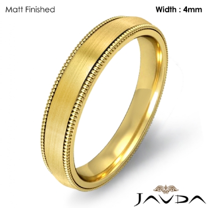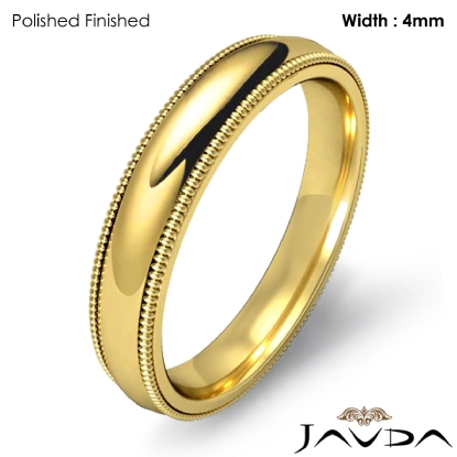 5.1 gram Men's 18k Gold Yellow Solid Wedding Band. Dome milgrain edge style confort-fit band. Ring Size is 4". Width is 4mm. Available in high polish and matt finish.