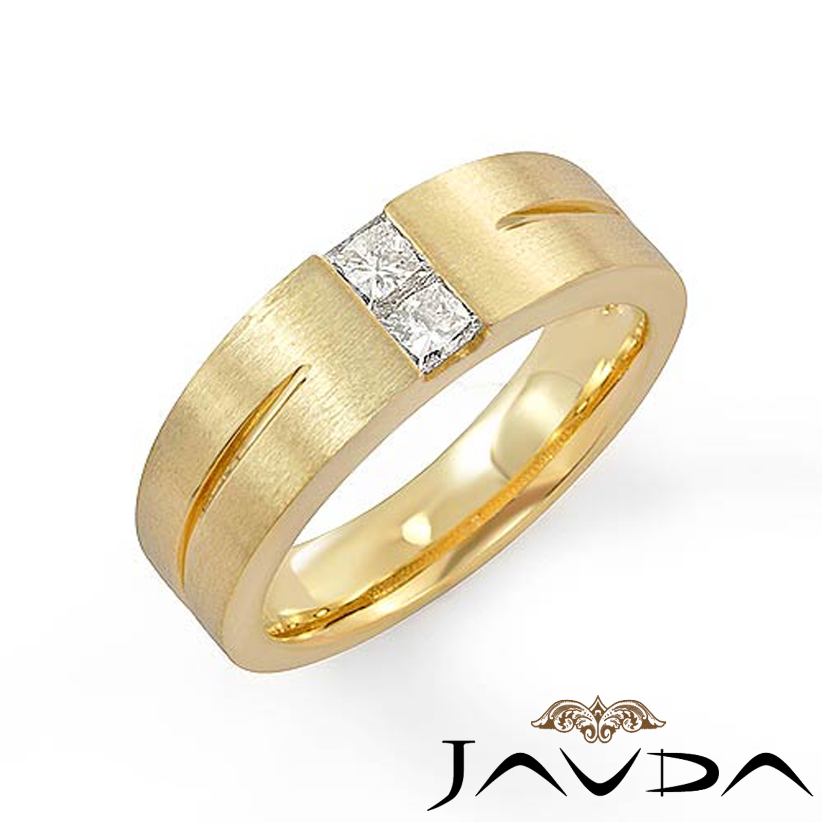 This comfort fit matte finish men's diamond half wedding band is crafted in 14k Gold Yellow. Showcasing matte finished and center grooved with 2 princess cut diamonds in a channel setting.