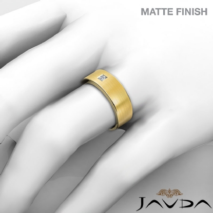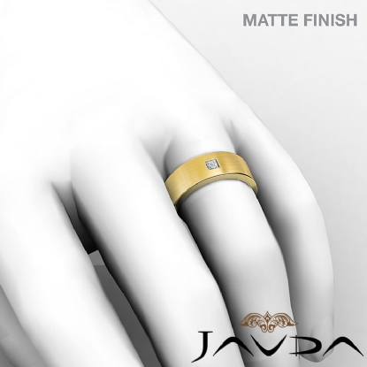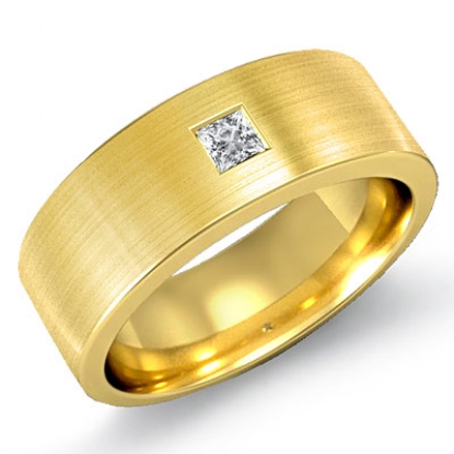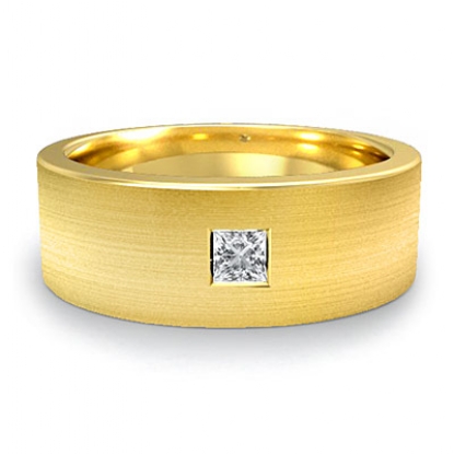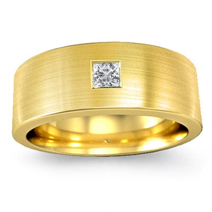Fashionable flat brushed finish men's diamond half wedding band is made from 18k Gold Yellow. Showcasing flat brushed finished with princess cut diamond in a bezel setting.