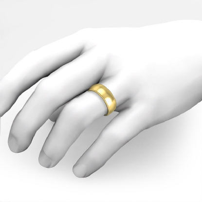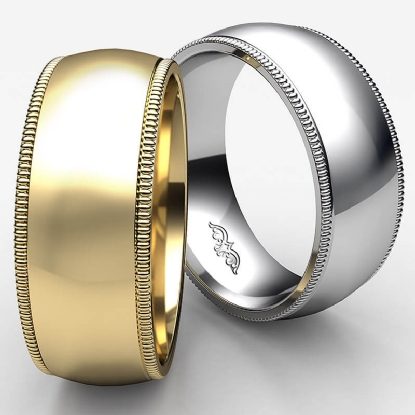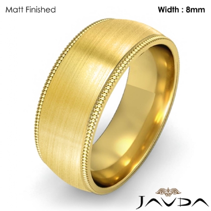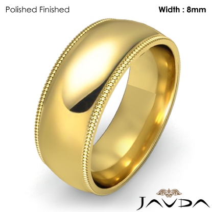8.9 gram Men's 14k Gold Yellow Solid Wedding Band. Dome milgrain edge style confort-fit band. Ring Size is 5". Width is 8mm. Available in high polish and matt finish.