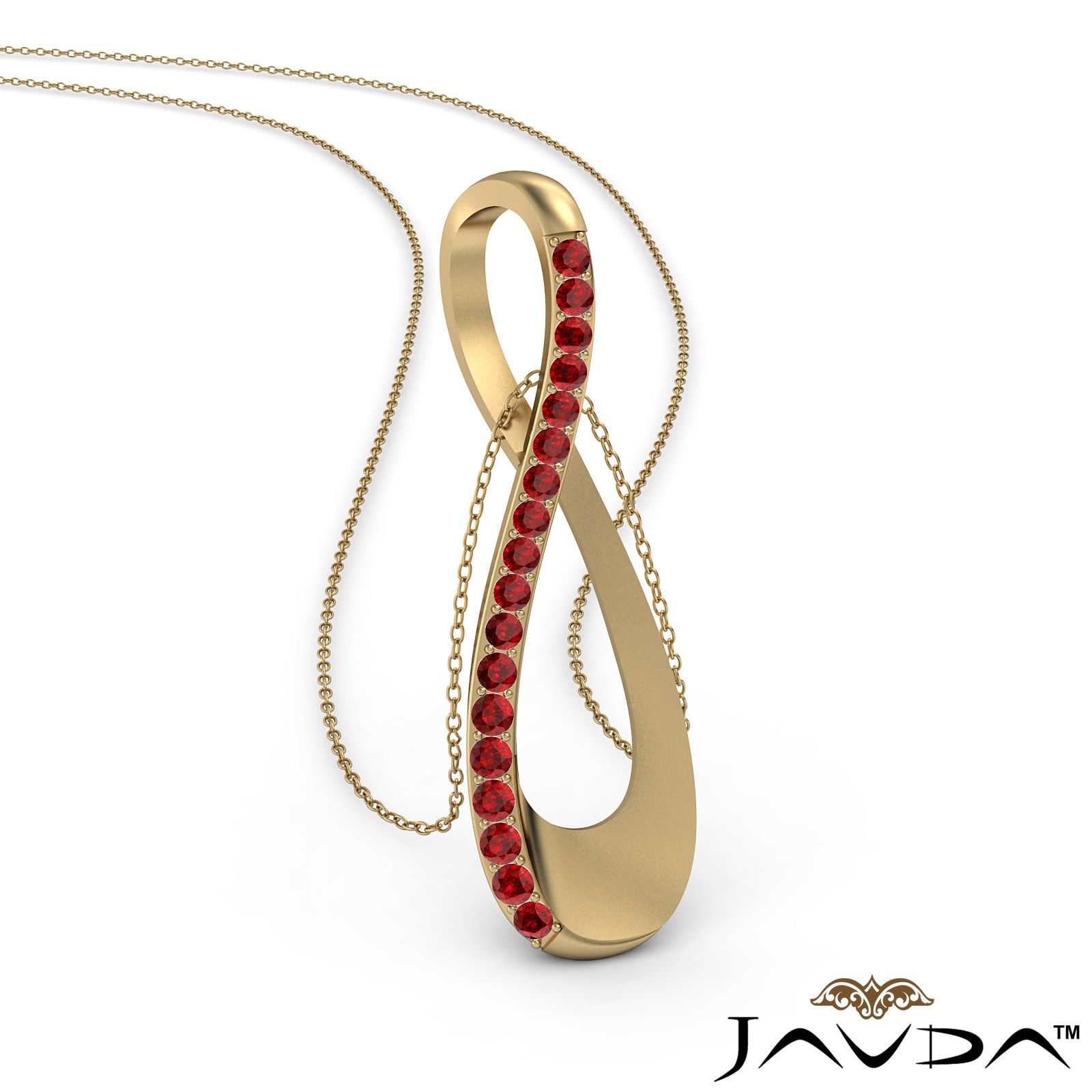 Affordable gemstone infinity pendant necklace made in 18k Gold Yellow. This stylish infinity symbol pendant features round ruby gemstone in micro pave setting and 18 inch rolo chain.