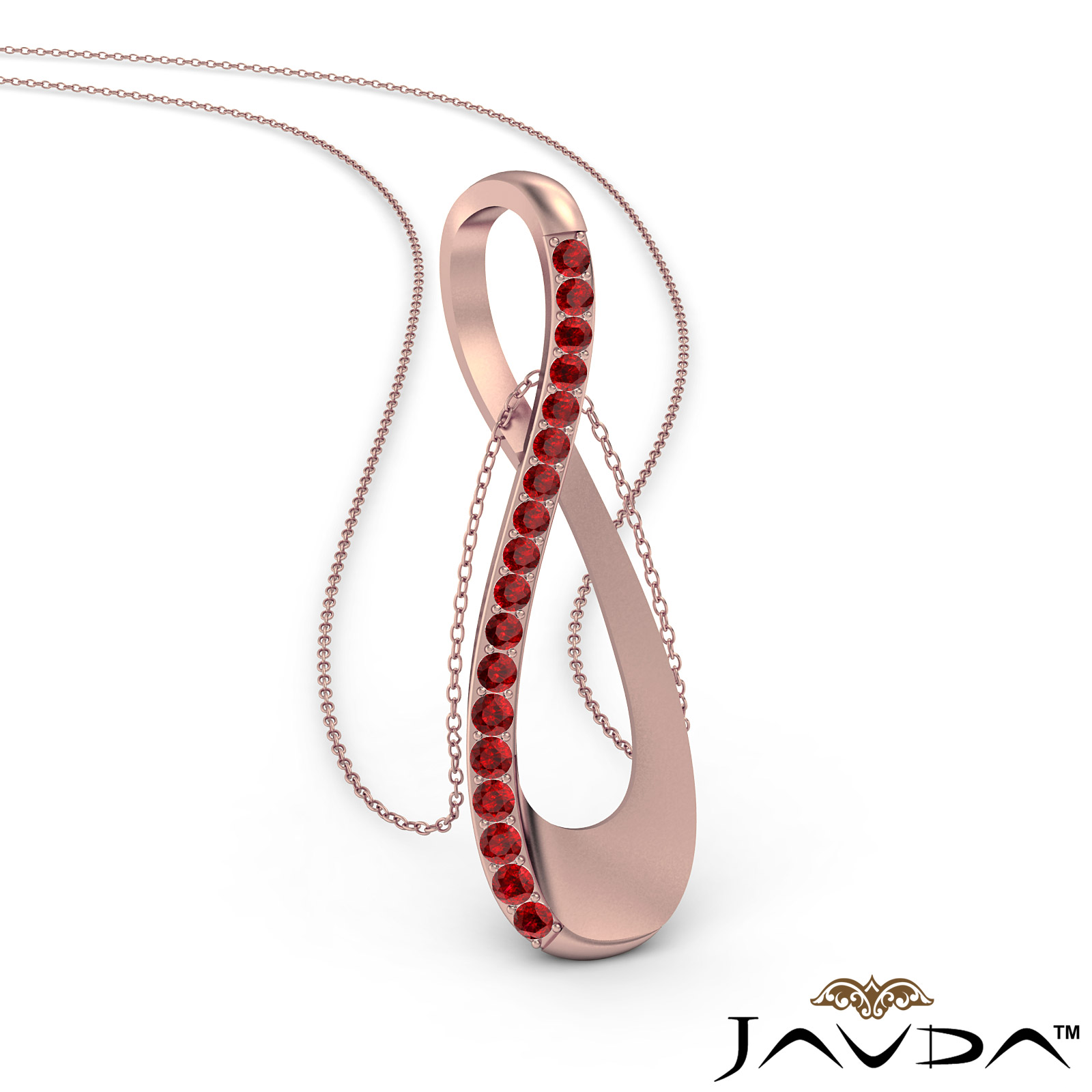 Affordable gemstone infinity pendant necklace made in 18k Rose Gold. This stylish infinity symbol pendant features round ruby gemstone in micro pave setting and 18 inch rolo chain.