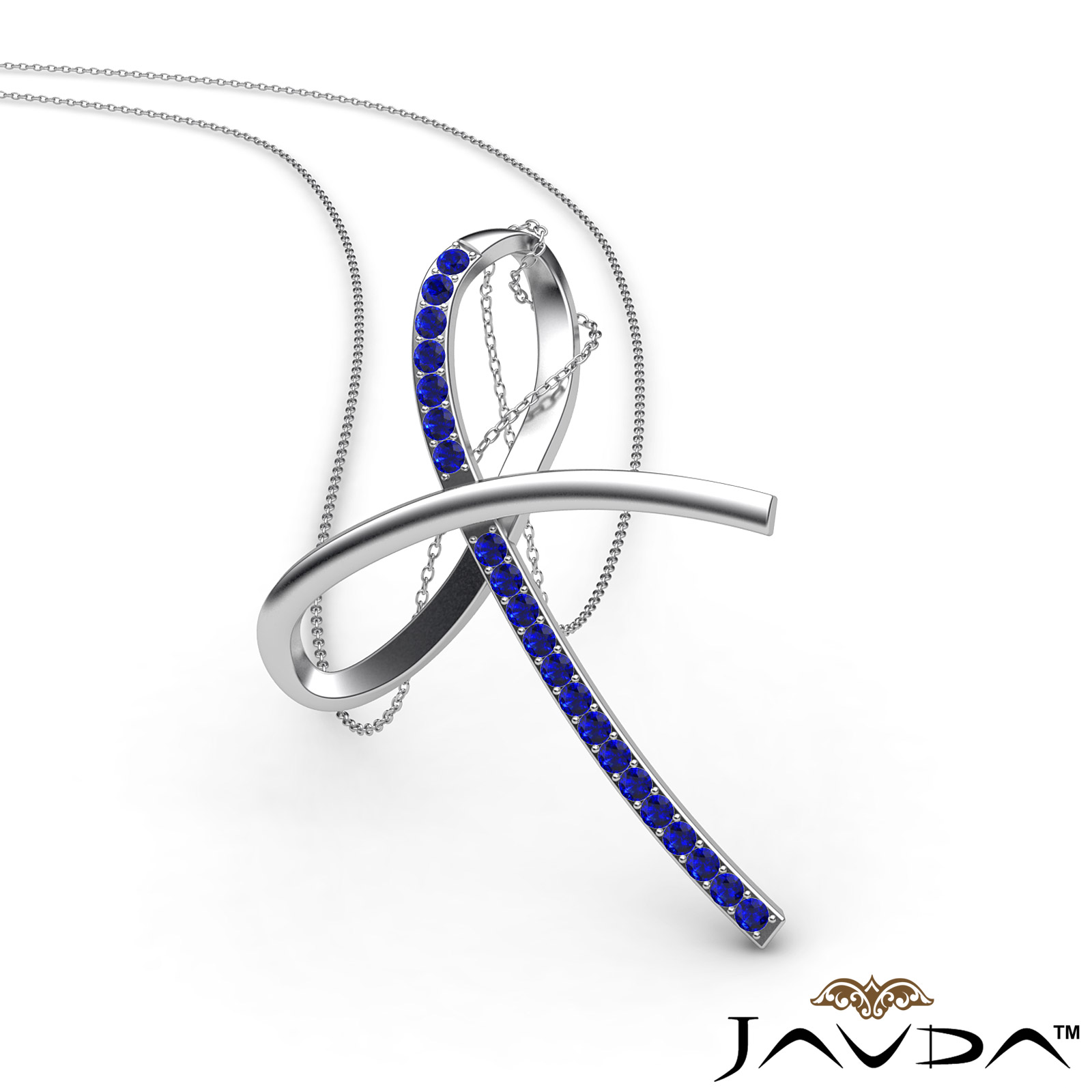 Simple and elegant sapphire bow pendant necklace crafted in 18k Gold White. This charming pendant features tiny round sapphire gemstone adorn in micro pave setting with 18 inch rolo chain.