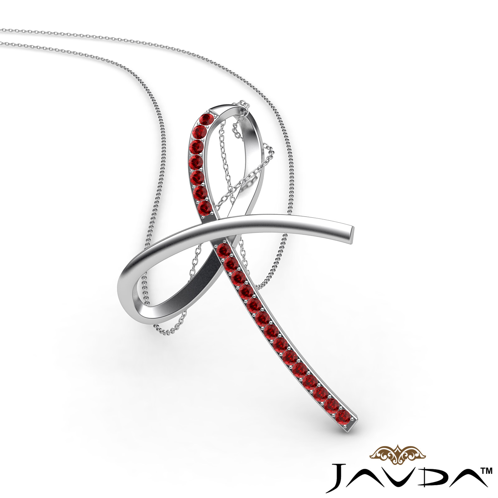 Simple and elegant ruby bow pendant necklace crafted in 18k Gold White. This charming pendant features tiny round ruby gemstone adorn in micro pave setting with 18 inch rolo chain.