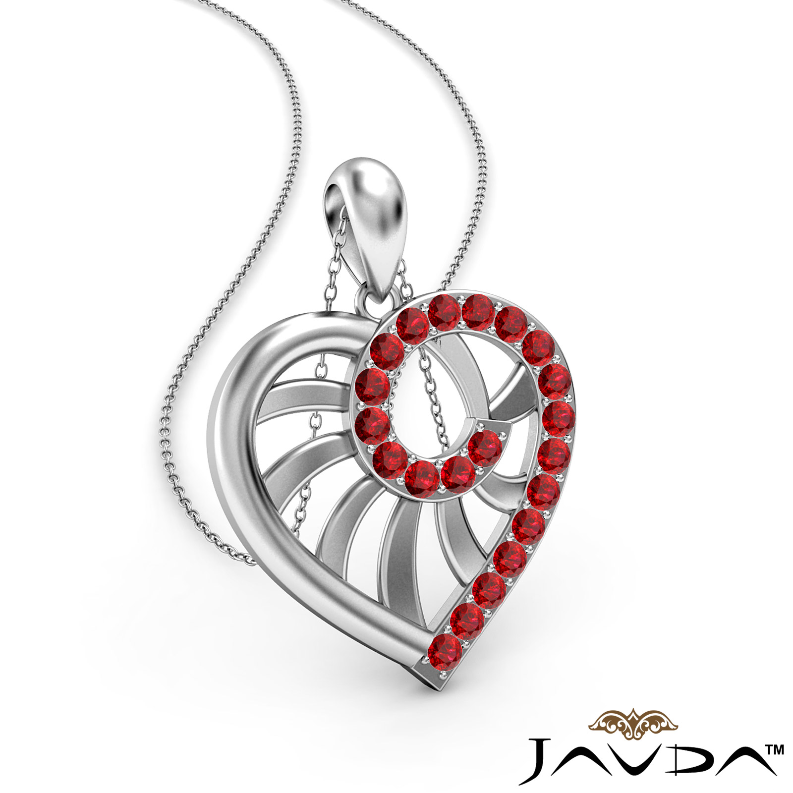 Stunning swirl heart pendant necklace crafted in 18k Gold White. Features round ruby gemstone one side of the heart in a micro pave setting with glimmering 18 inch rolo chain that secures with a spring ring clasp.