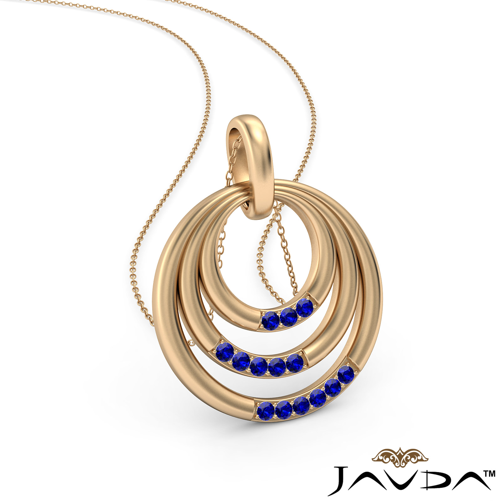 A sparkling triple circle pendant necklace crafted in 18k Gold Yellow. This modern pendant features round sapphire gemstone in a micro pave setting with 18 inch rolo chain that secures with a spring ring clasp.