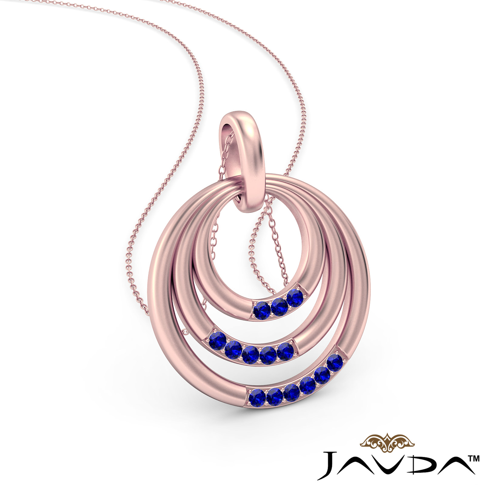 A sparkling triple circle pendant necklace crafted in 18k Rose Gold. This modern pendant features round sapphire gemstone in a micro pave setting with 18 inch rolo chain that secures with a spring ring clasp.