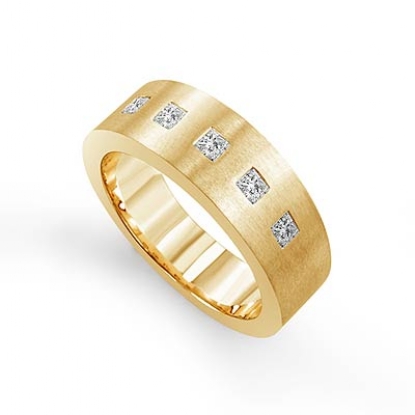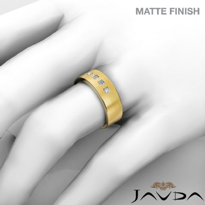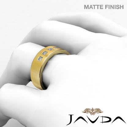 Stylish & bold men's matte finish 5 stone princess diamond half wedding band is crafted in 18k Gold Yellow. This ring features matte finished flat band with 5 princess diamonds set in a bezel setting.