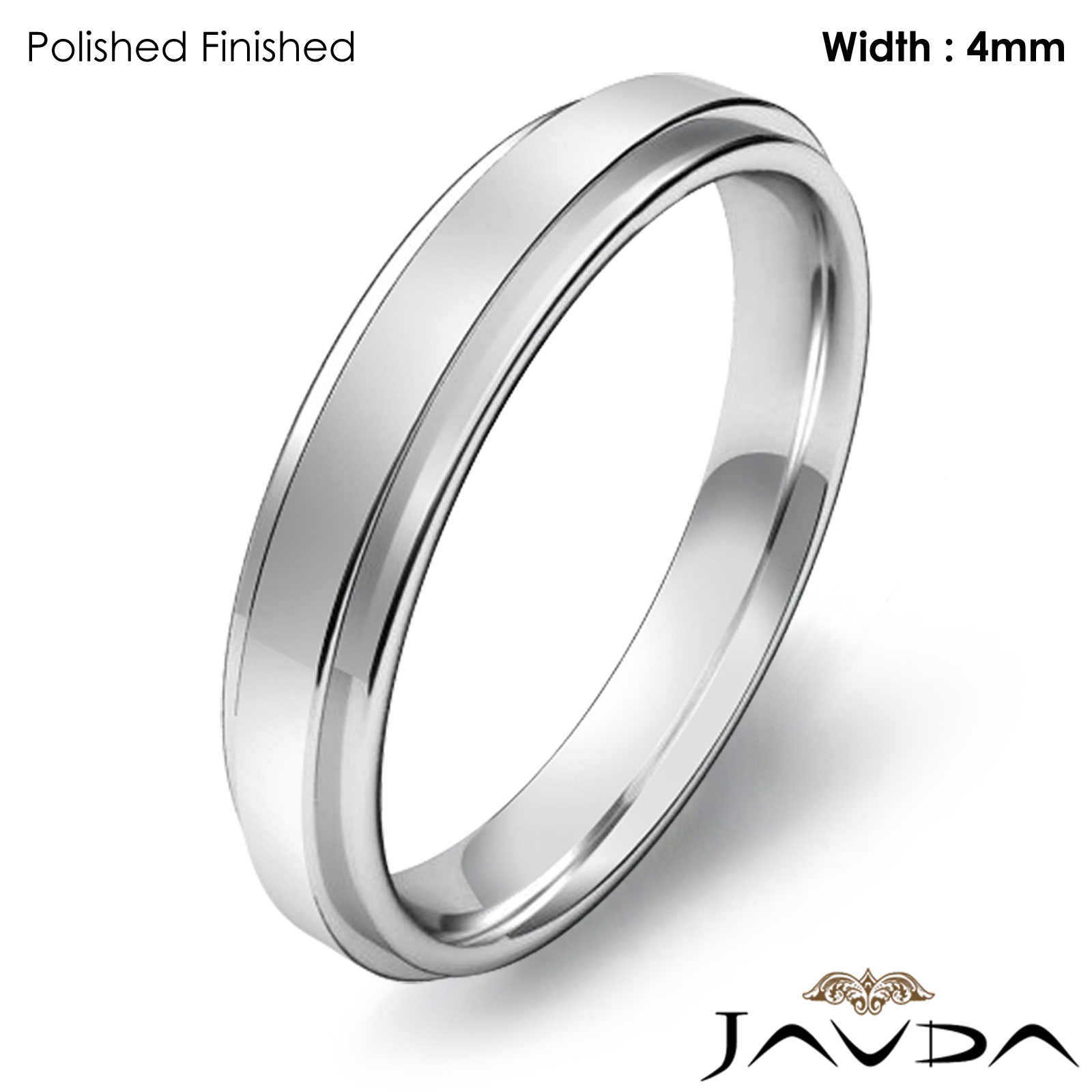 4.2 gram Men's 18k Gold White Solid Wedding Band. Flat Step Down edge comfort fit style band. Ring Size is 5". Width is 4mm. Available in high polish and matt finish.