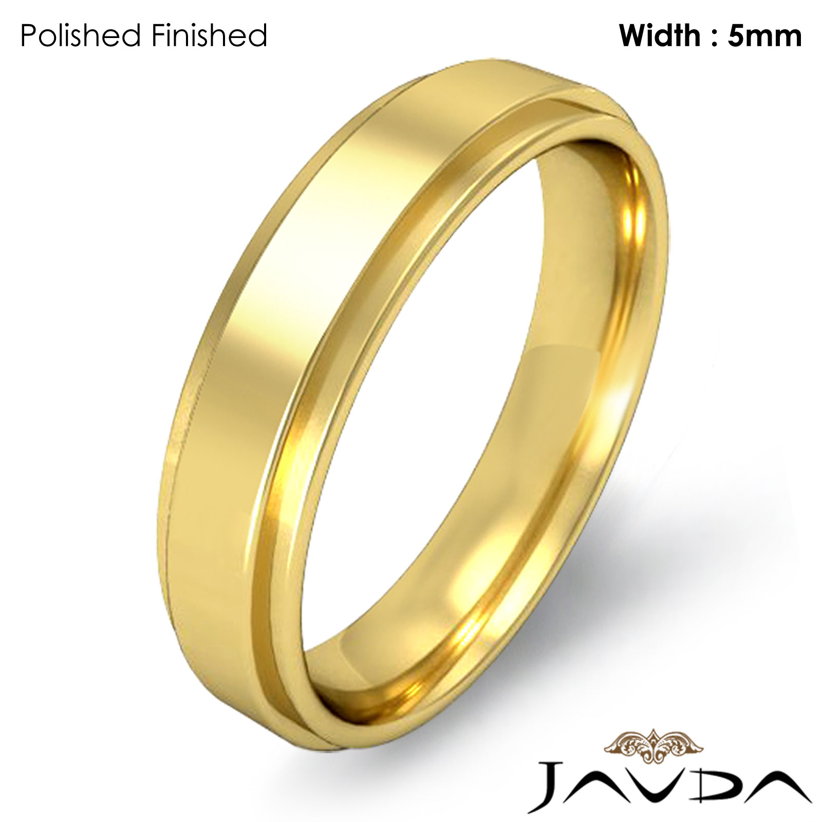 5.6 gram Men's 18k Gold Yellow Solid Wedding Band. Flat Step Down edge comfort fit style band. Ring Size is 5". Width is 5mm. Available in high polish and matt finish.