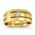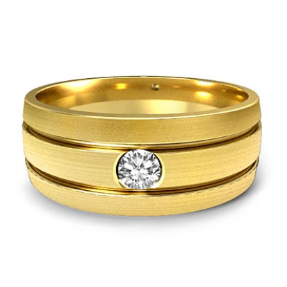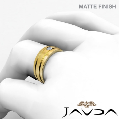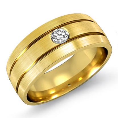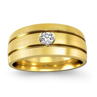 A classic low dome solitaire round diamond men's half wedding band is made from 18k Gold Yellow. This band features matte finish and parallel grooved with 1 round diamond in a bezel setting.