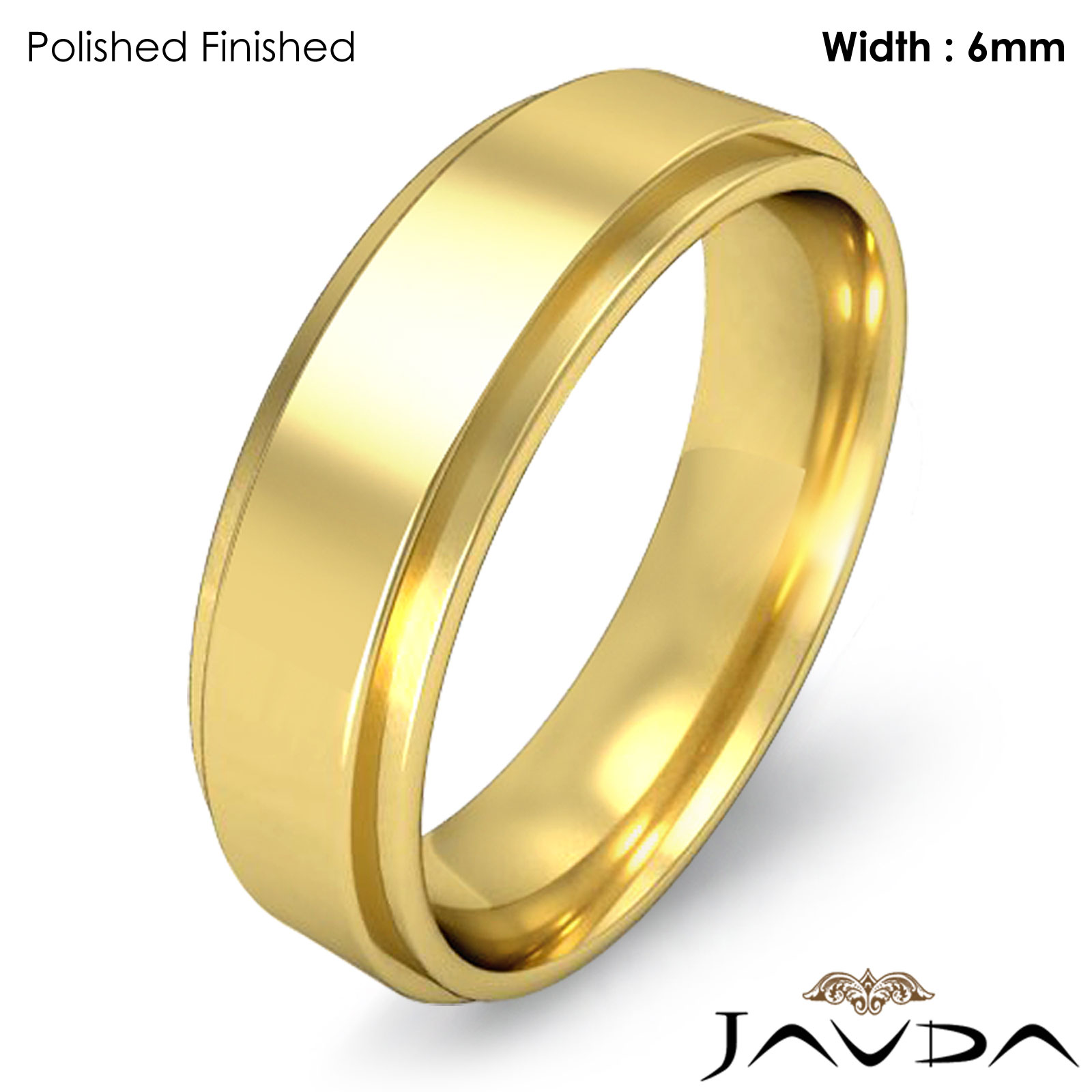 6.9 gram Men's 18k Gold Yellow Solid Wedding Band. Flat Step Down edge comfort fit style band. Ring Size is 5". Width is 6mm. Available in high polish and matt finish.