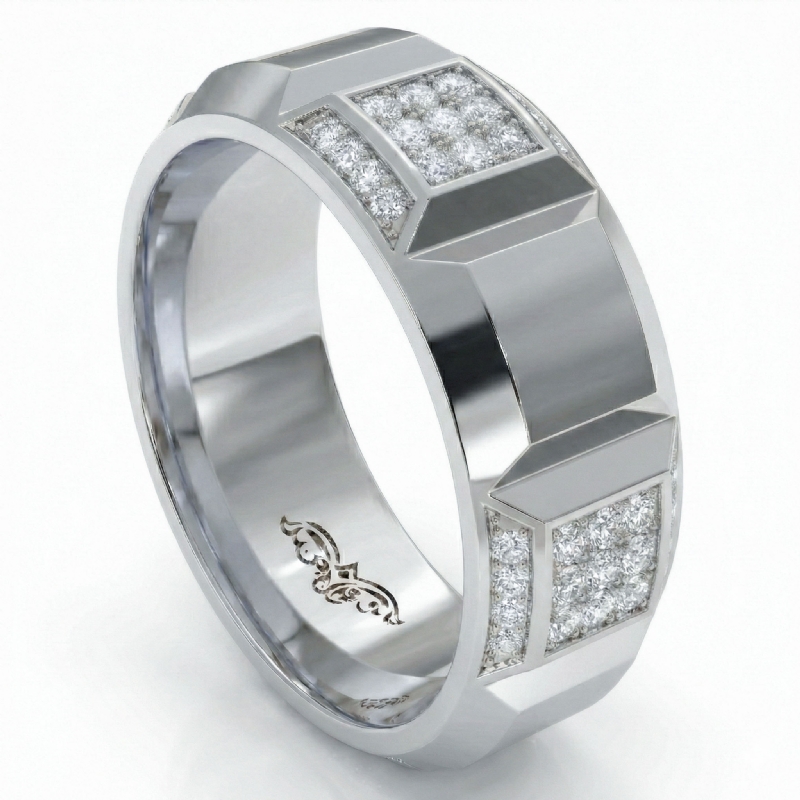 A lasting reminder of love and commitment, this stunning beveled edge men's diamond eternity wedding band handcrafted in 14k white gold. Showcases 0.80 carat round diamonds in a micro pave setting and center vertical cuts with beveled edges on sides of the ring. Also available in 14k & 18k white gold, yellow gold, rose gold and platinum 950. If you don't find your desired jewelry, please don't hesitate to contact our designer to make your custom jewelry design
