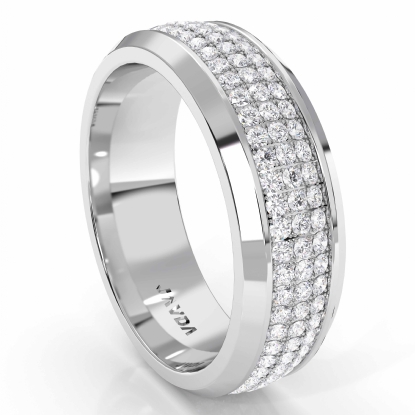 An eye-catching beveled edge three-row men's diamond eternity wedding band made in 14k white gold. This stunning ring showcases 1.60 carat round diamonds in a micro pave setting with polished finish beveled edges. Also available in 14k & 18k white gold, yellow gold, rose gold and platinum 950. If you don't find your desired jewelry, please don't hesitate to contact our designer to make your custom jewelry design