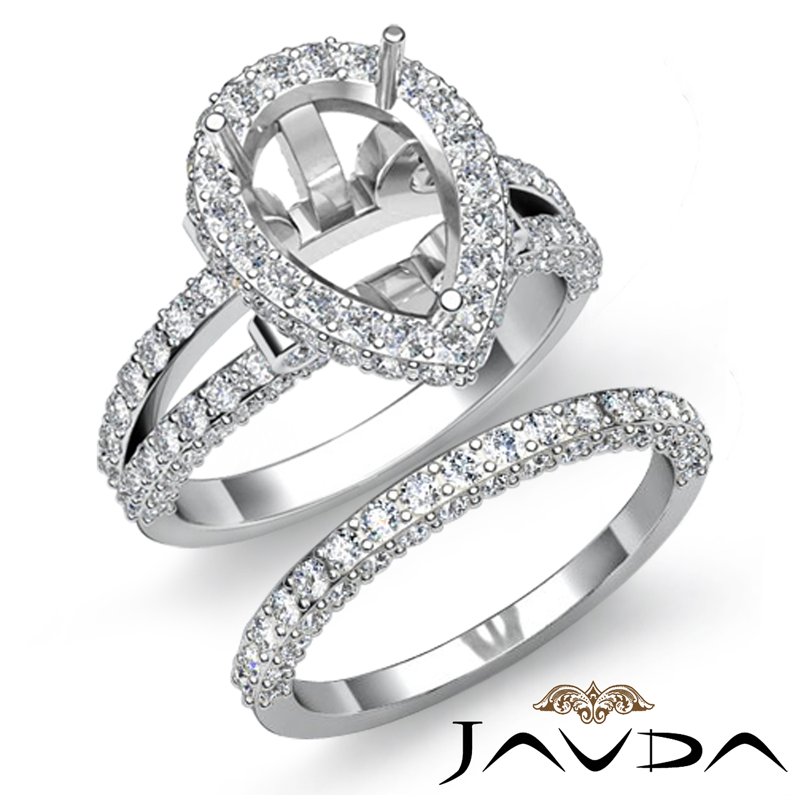 Beautiful & delicate, this 14K white gold bridal set consists of a semi mount engagement ring and a matching band, featuring 2.72ct. round pave set diamonds in halo and split shank.