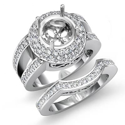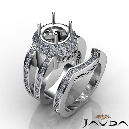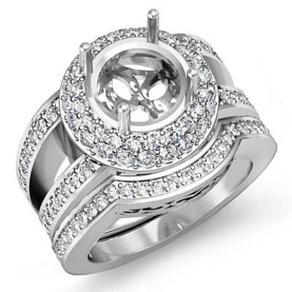 Intricately crafted, this 1.85ct. round semi mount diamond engagement ring and matching band feature, pave set diamonds in the beautiful halo and split shank. This bridal set is made in enduring 14K white gold.