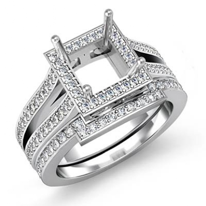 Breathtaking in design, this 1.35ct. bridal set consists of a princess semi mount engagement ring and a matching band. Made in 14K white gold, it features pave set round diamonds in halo and along the split shank.