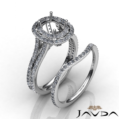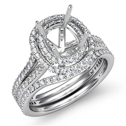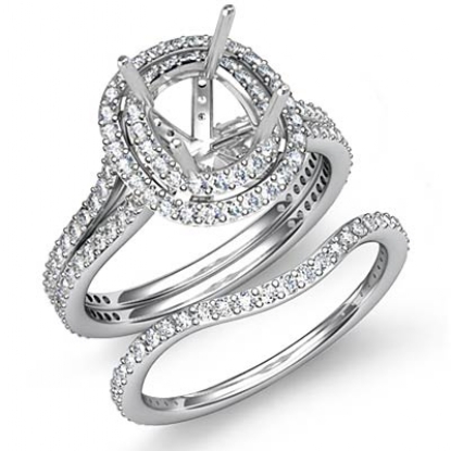 Elegant in every way, this 2ct. cushion semi mount diamond engagement ring with matching band, featuring pave set diamonds on the split shank and a double halo design. This bridal set is made in enduring 14K white gold.