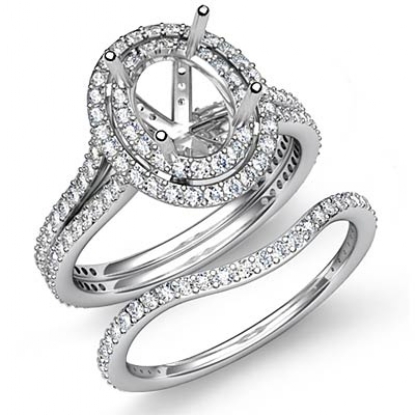 Elegance defined, with this 2ct. oval semi mount diamond engagement ring with matching band, featuring pave set diamonds on the split shank and a double halo design. Made in 14K white gold, this bridal set is the best choice.