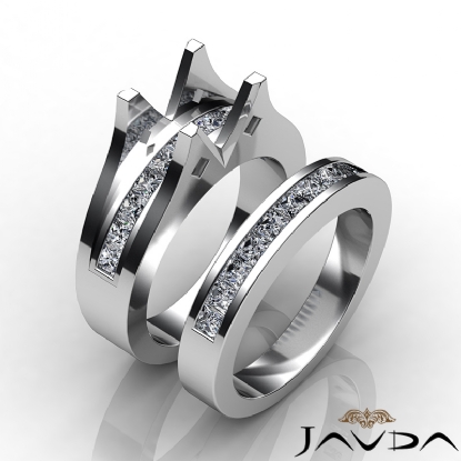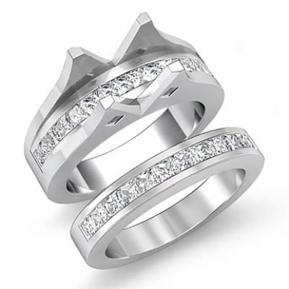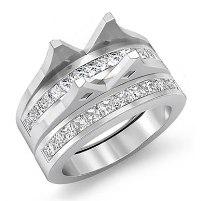 Unique in its own way! The 2.1ct. princess channel set diamond engagement ring for round semi mount comes with a matching band. A complete bridal set made in 14K white gold.
