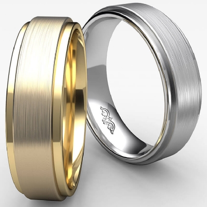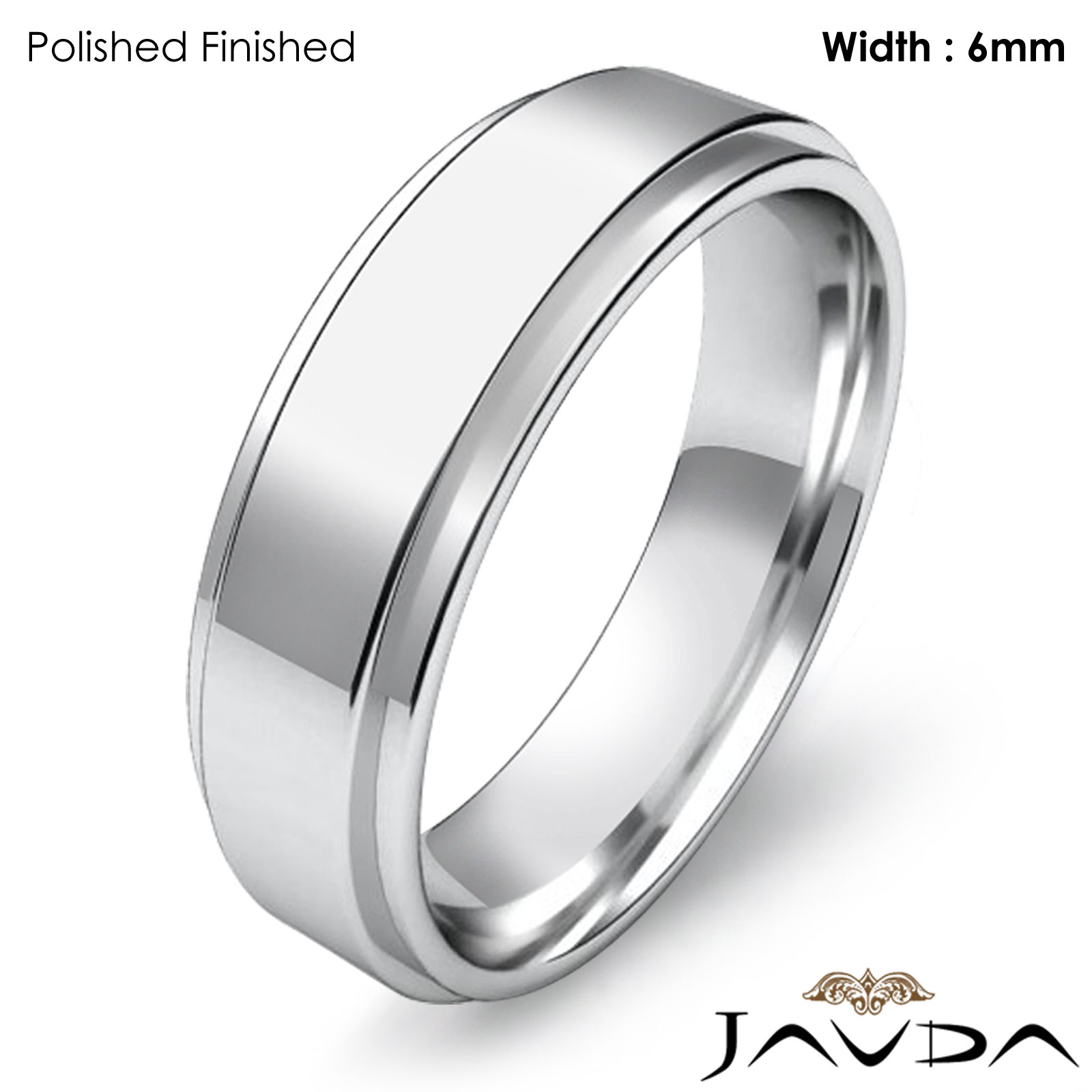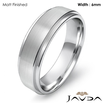 6.1g Men's 14k White Gold Solid Wedding Band. Flat Step Down edge comfort fit style band. Ring Size is 4. Width is 6mm. Available in high polish and matt finish.