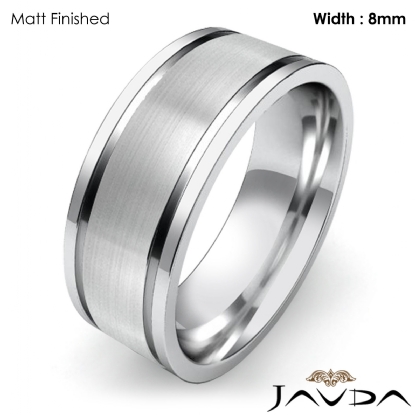 8.7g Men's 14k White Gold Solid Wedding Band. Flat Newport style band. Ring Size is 4. Width is 8mm. Available in high polish and matt finish.