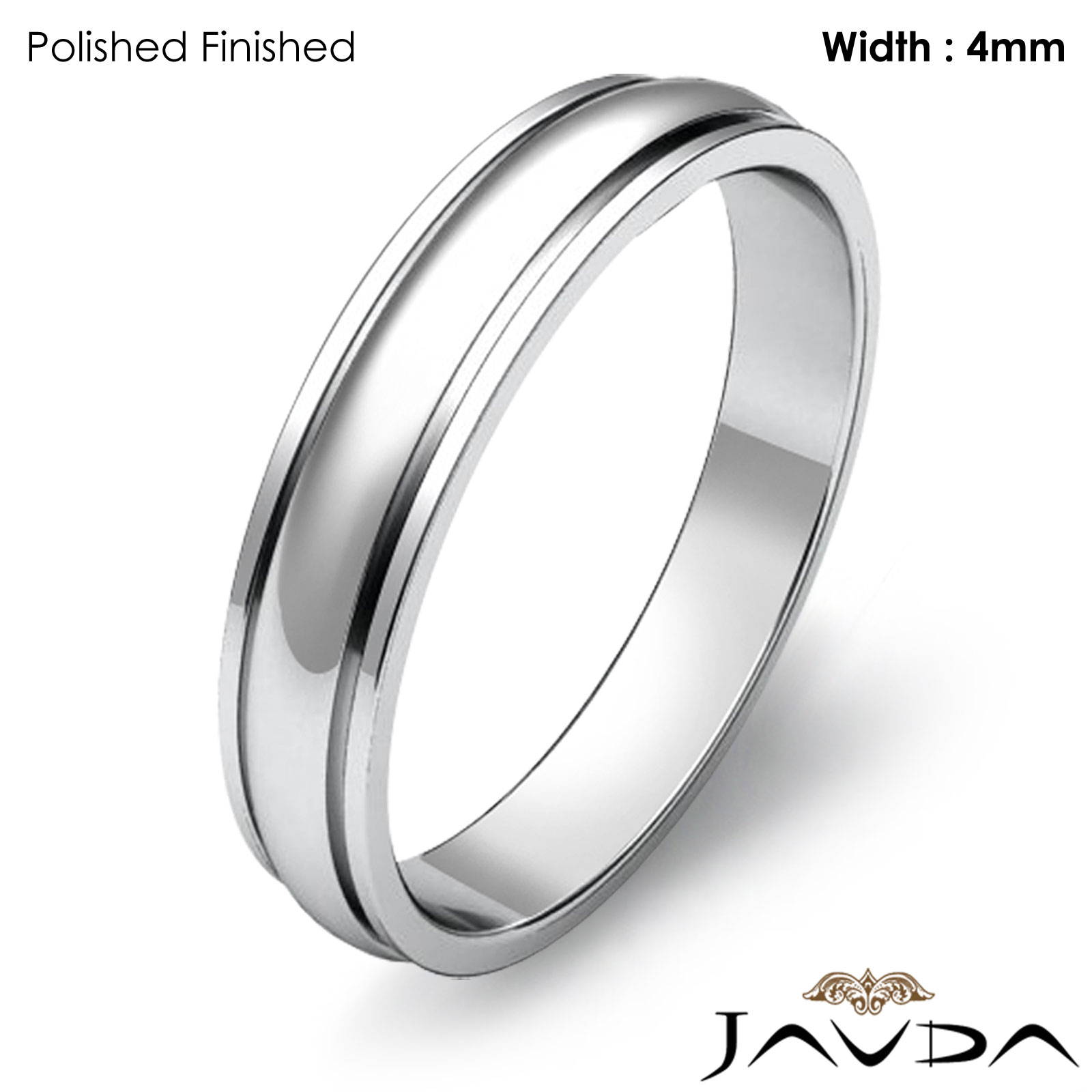 2.9g Men's 14k White Gold Solid Wedding Band. Dome Step Down style band. Ring Size is 4. Width is 4mm. Available in high polish and matt finish.