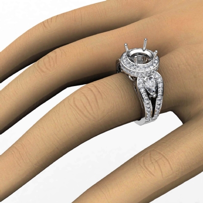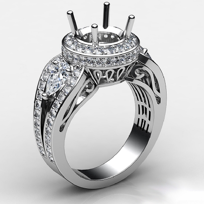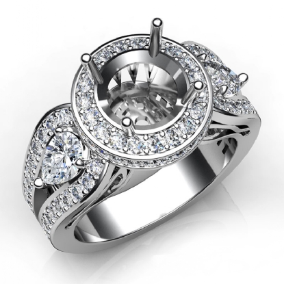 Capture the moment with this 14K white gold 3 Stone engagement ring, featuring a round semi-mount halo of round diamonds. It showcases 1.85ct. of total round diamonds & 0.50ct. of side pear diamonds in prong setting beautifully placed on the ring's shank.