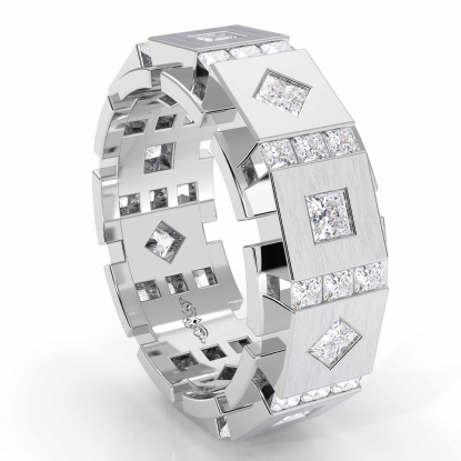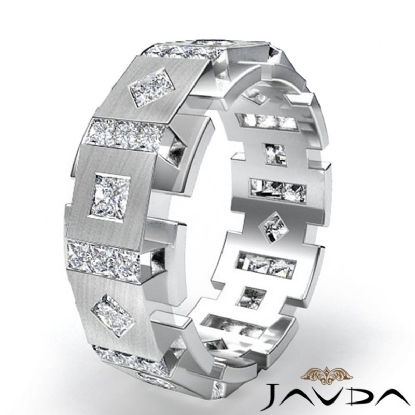 This hot diamond eternity men's wedding band crafted in 14k white gold. Featuring 3 carat princess diamonds in a channel & bezel setting, designed in a box & kite style. Available in 14k & 18k white gold, yellow gold and rose gold & platinum 950.