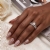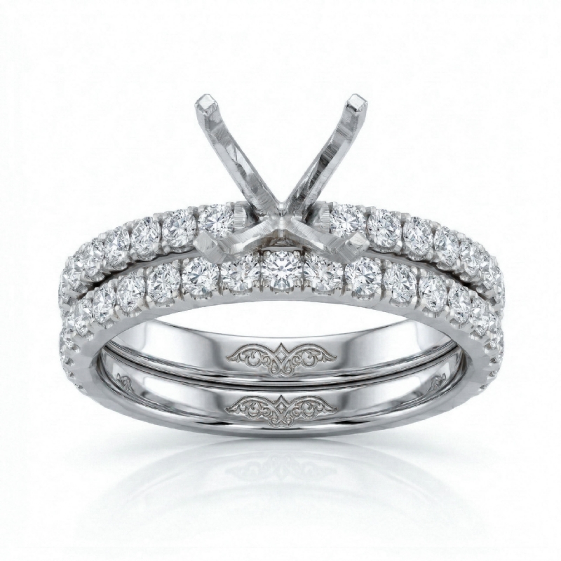 Sleek and elegant, this 14K white gold semi mount bridal set features prong set round diamonds on the engagement ring and the matching band. The total weight of this set is 1.2 carat.
