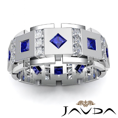 3 Carat Princess Diamond & Blue Sapphire Men's Diamond Eternity Wedding Band 14k White Gold Ring Channel & bezel Set