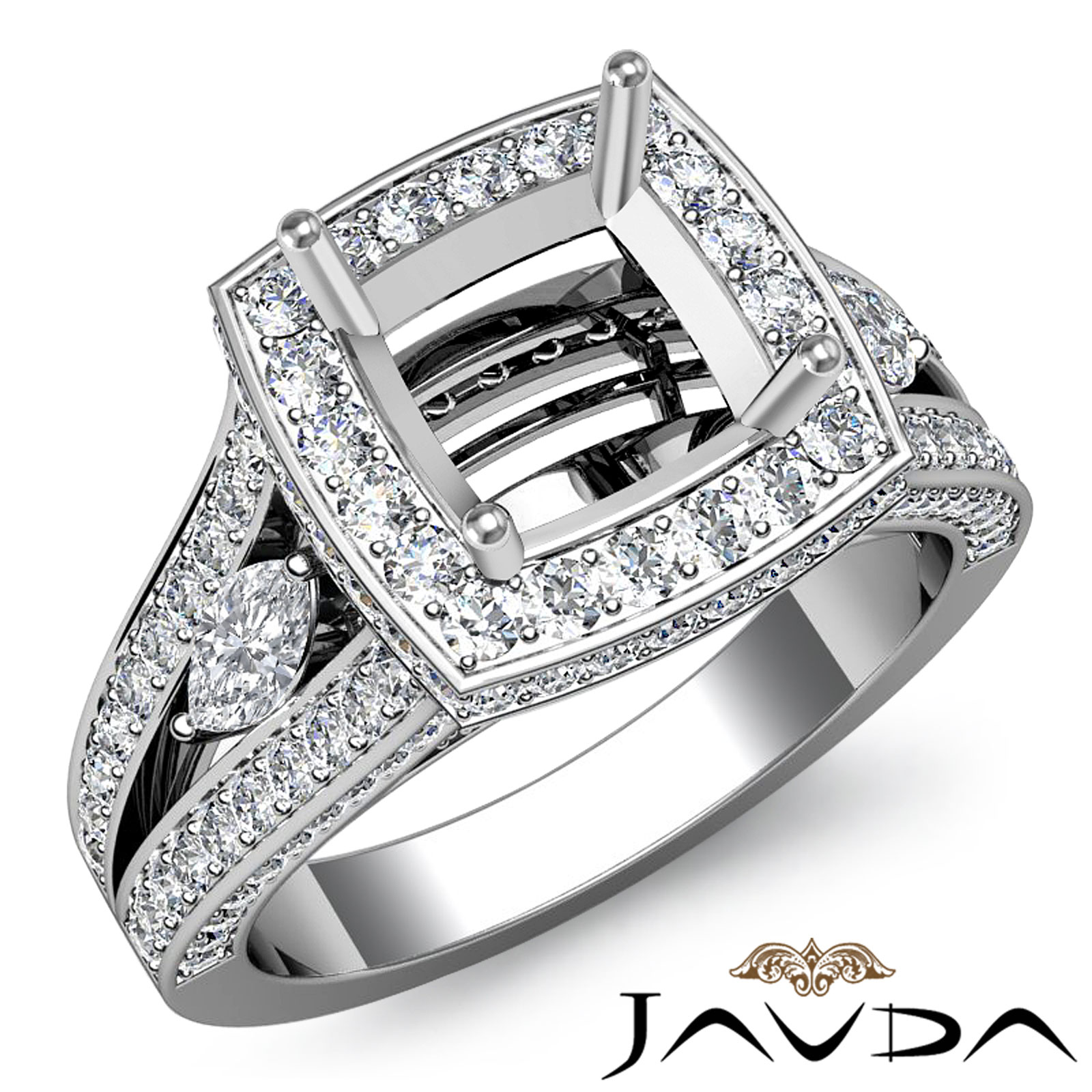 Cushion Diamond Engagement Ring Split Shank SemiMount Pave Set 14K W Gold 1.7Ct