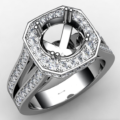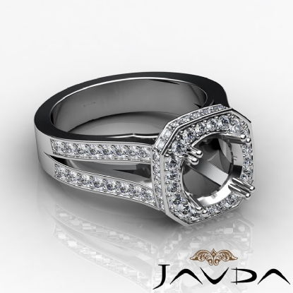 Undeniably striking, this round semi mount ring is made in 14K white gold. The diamond engagement ring features 1.34ct. pave set round diamonds in halo & along the sparkling shank.