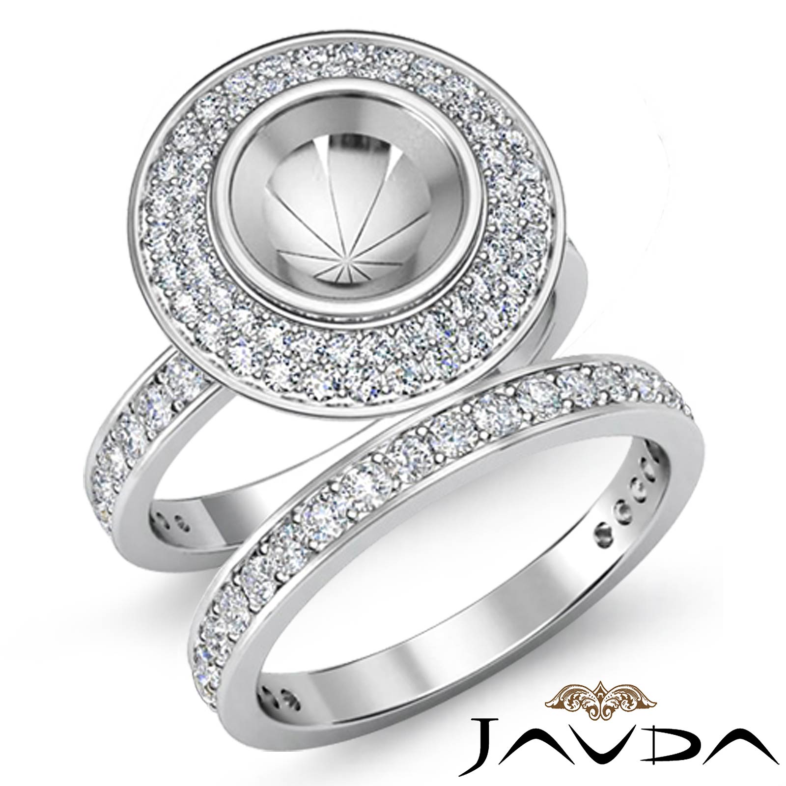 Intricately designed, this round semi mount engagement ring and wedding band features 1.28ct. round pave set diamonds in a two layer halo and along the shank. Made in 14K white gold, this bridal set is truly beautiful.