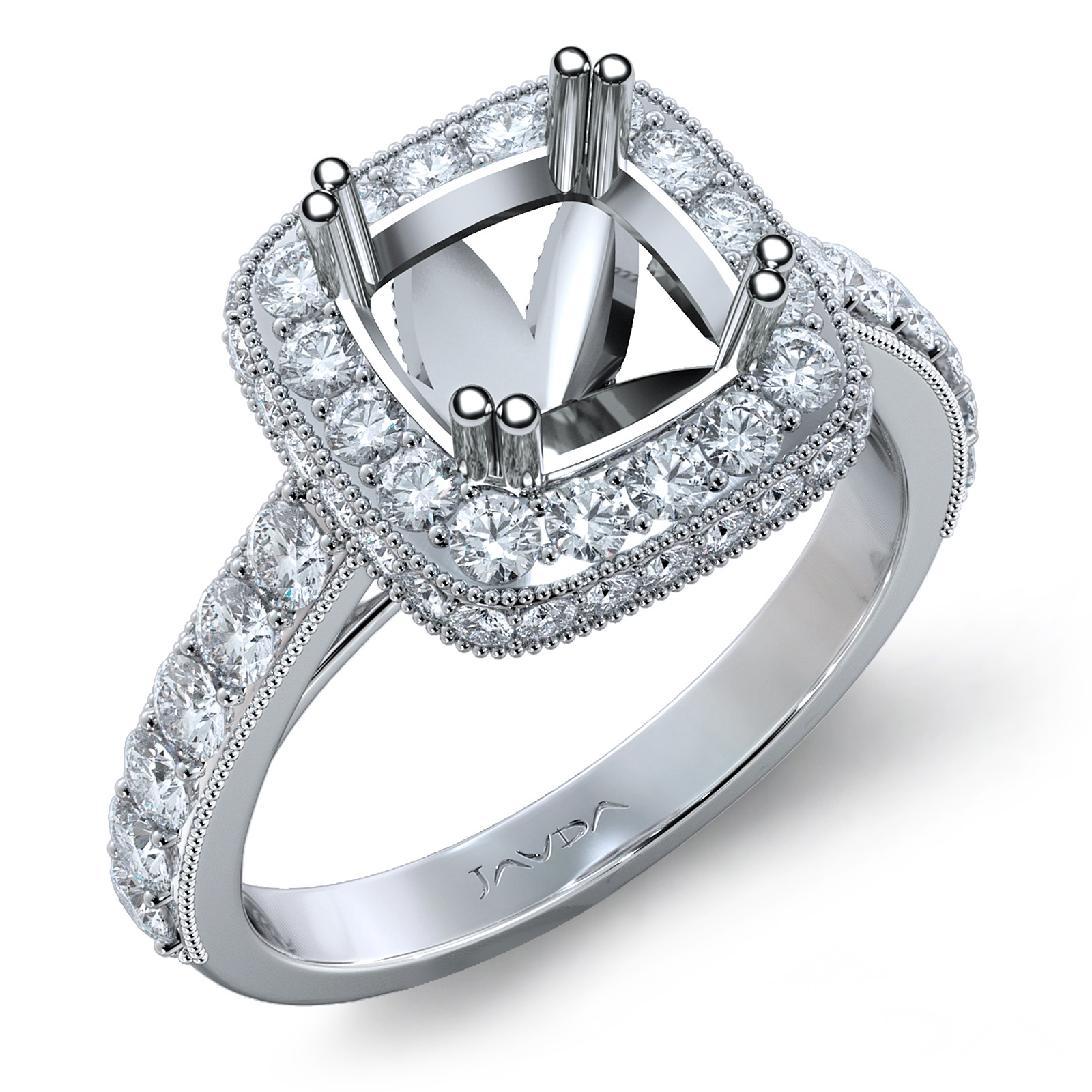 Lavishly showcasing your center cushion semi mount with brilliance, this diamond engagement ring is made in 14K white gold. It features 1.1ct. halo pave set round diamonds in Milgrain halo & along the shank. It Weight 5.3 gram.