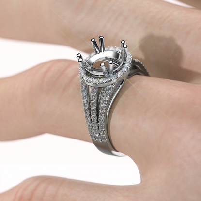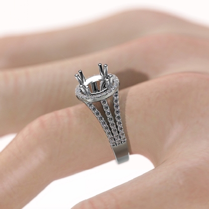 Forever timeless, this luxurious 14K white gold engagement ring has a round semi mount. It showcases 1ct. Halo U Cut shared Prong set round diamonds in halo & along the shank and its 5.7 gram.