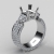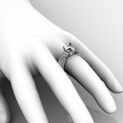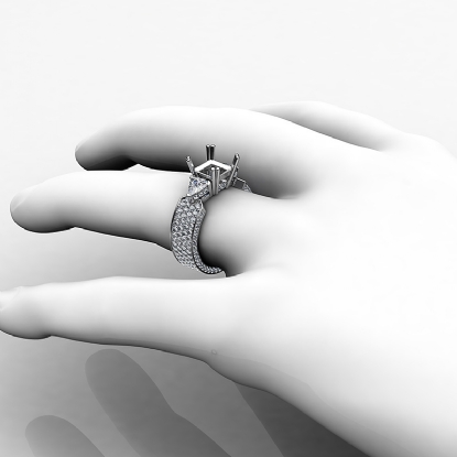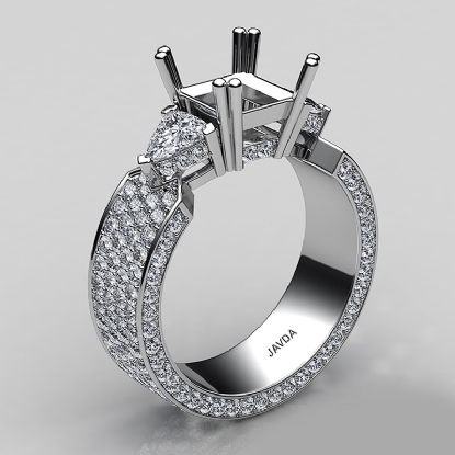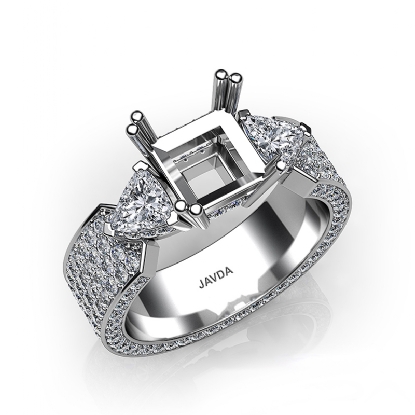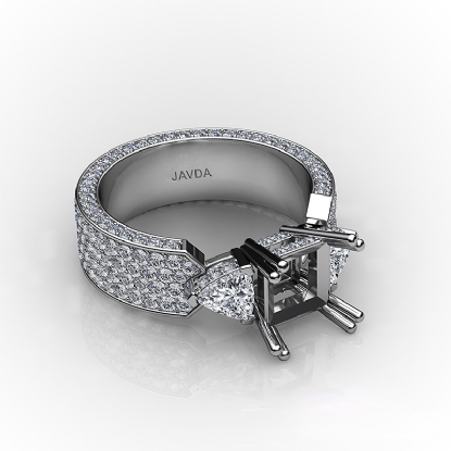 Beautiful in its own way! This 3 stone princess cut diamond engagement semi mount ring made in 14k white gold. Showcases 1.9ct. round diamonds on shank in micro pave setting and 0.50 carat trillion cut diamonds in a prong setting.